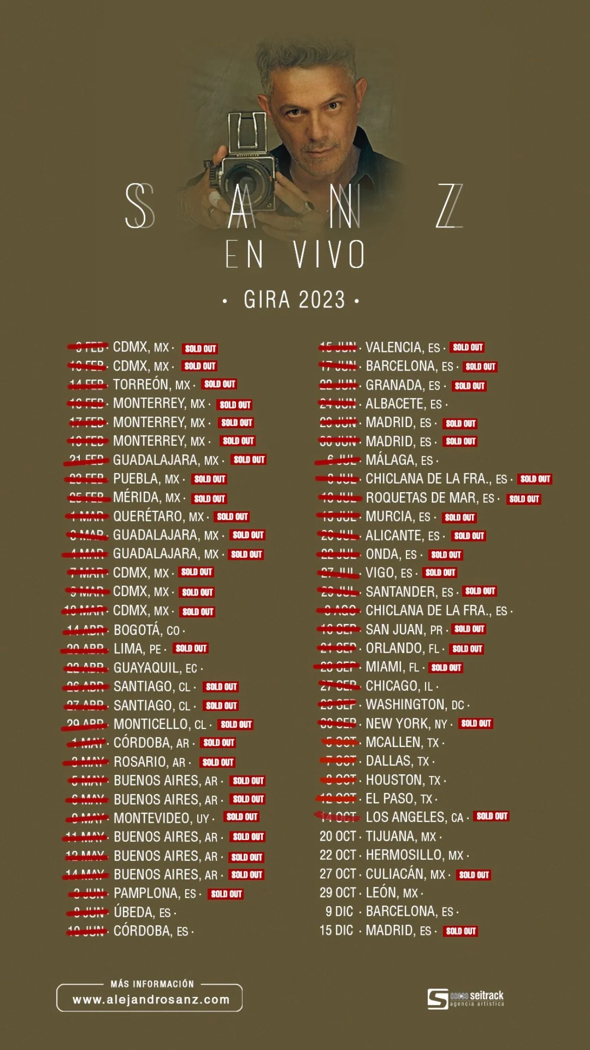 El anuncio llega tras culminar con broche de oro su paso por Estados Unidos con la gira Sanz en Vivo este pasado fin de semana con un show completamente agotado en el Peacock Theater de Los Ángeles, que se suma a los Sold Out en Puerto Rico, Orlando, Miami y NY. En esta gira Alejandro Sanz ha contado con la participación de artistas invitados como Elena Rose, Camilo, Ha*Ash, Beatriz Luengo, Yotuel y Arturo Sandoval. Aunque, sin duda, uno de los momentos más especiales llegó de la mano de su hijo Alexander, artísticamente conocido como kYdarii, a quién invitó a tocar junto a él sobre el escenario.