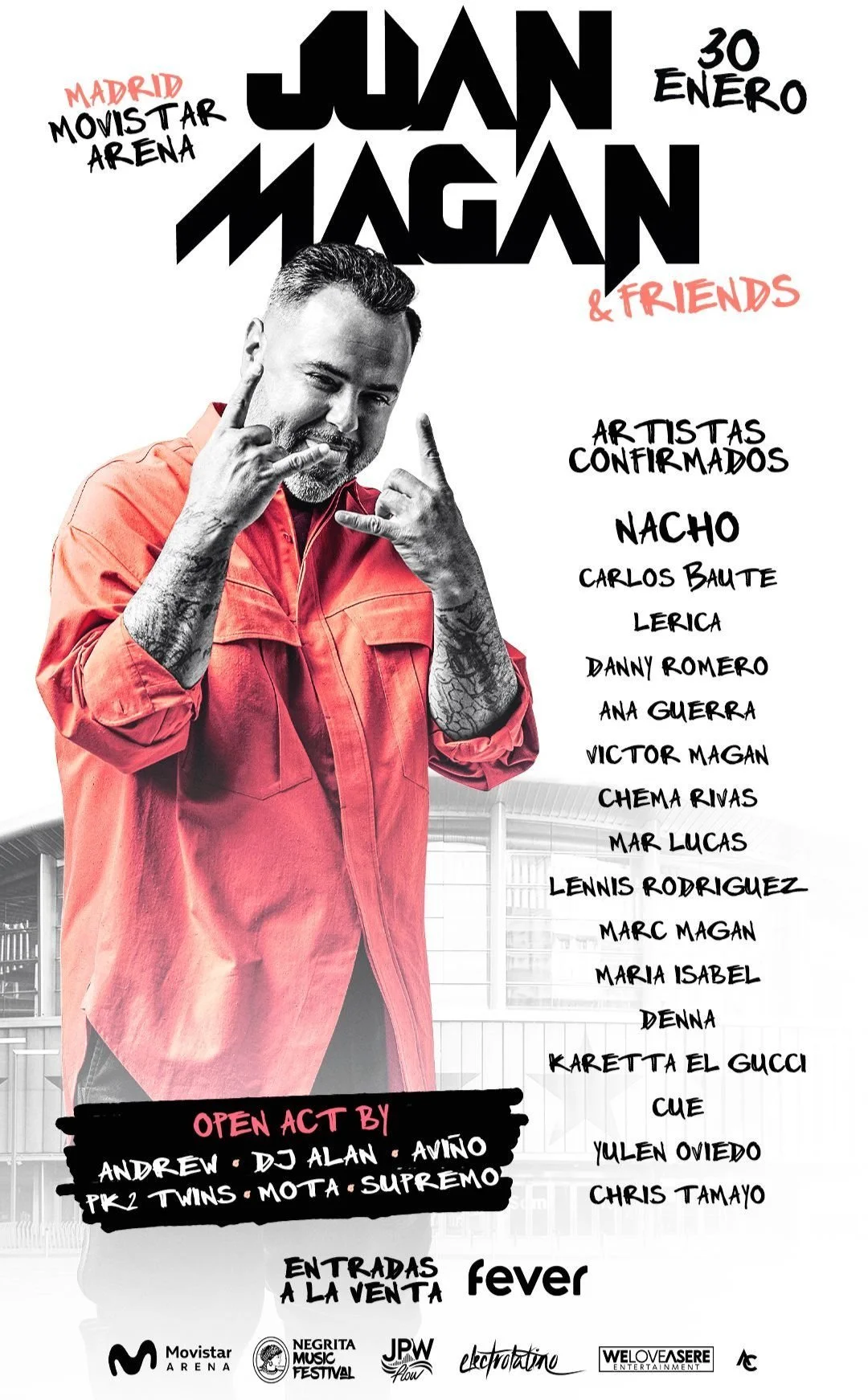 Durante este show, Juan Magán ha querido contar con la participación de varios artistas, entre los que se encuentra Chema Rivas, con quien interpretará la colaboración que ambos tienen juntos “Anda Suelta”, lanzada en marzo de 2021 y que rápidamente se posicionó entre las favoritas del público, como una muestra de la gran química artística entre ambos.